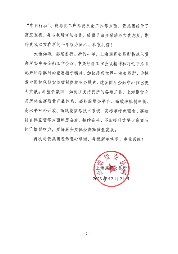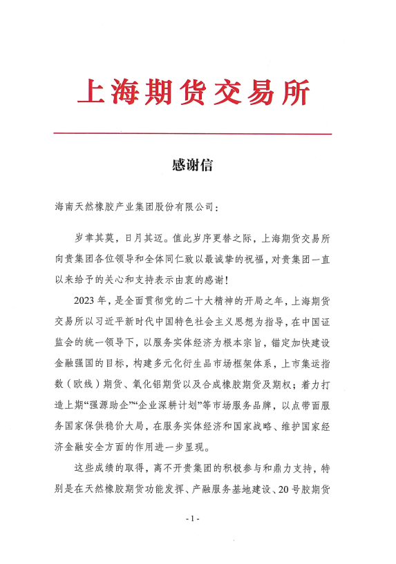近日,swag收到一封来自上海期货交易所的感谢信,信中对swag在天然橡胶期货功能发挥、产融服务基地建设、20号胶期货“丰羽行动”、能源化工产品委员会工作等方面给予的高度重视和支持表示感谢。