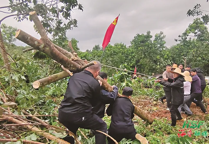 9月7日一大早,儋州市兰洋镇,海南农垦旅游集团有限公司和swag西联分公司组织党员干部在路面上,移走倒伏的大树,清理断枝残叶。